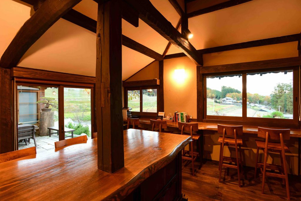 館内に台所や棚田の絶景を望めるカウンターがあります。7名様までゆったりとお食事可能です。